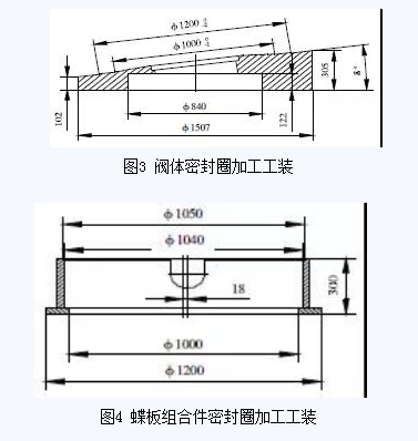 從三偏心金屬硬密封蝶閥的結構特點分析,蝶板組合件密封圈為不銹鋼板與石棉板的組合件,閥體密封圈為硬質(zhì)合金,硬度很高,進刀量很難控制,不易一次加工成型,而且加工面的粗糙度要求很高。為保證加工要求,工藝過程為閥體或蝶板組合件粗加工—閥體密封圈堆焊硬質(zhì)合金—保溫12h—熱處理消除熱應力—上工裝粗車密封面—上工裝精車密封面—上磨頭磨削密封面—閥體與蝶板組合件合鏜軸孔—強度試驗—密封試驗。