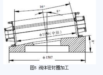 閥體起密封作為的為密封圈,焊接在閥體內(nèi)(圖5)。在2.5m立車上將組焊好的閥體裝夾在閥體密封圈加工工裝上,將立車刀桿旋轉8°,根據(jù)圖紙設計要求,找正后沿圓錐母線方向走刀,車至未焊不銹鋼前的尺寸。然后堆焊不銹鋼,最后將焊好不銹鋼的閥體重新上立車,按上述方法車閥體密封圈至圖紙要求尺寸。最后在立車刀架上裝磨頭,對閥體密封圈進行磨削處理,使其達到圖紙設計粗糙度要求。