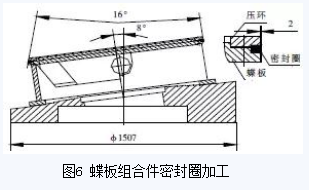 蝶板組合件起密封作用的零件是密封圈,密封圈為斜錐結構,其錐頂角為16°,厚度為13.5mm,由5層石棉板及4層不銹鋼板復合而成(圖6)。密封圈必須與蝶板和壓環(huán)等組裝在一起,加工時才能防止密封圈夾層中的不銹鋼板及石棉板翹曲變形。根據(jù)其結構特點,對蝶板組合件密封圈采用以下加工方法:(1)先在2.5m立車上分別把蝶板和壓環(huán)上的各止口加工到圖紙要求尺寸,外圓不加工;(2)按圖紙要求對壓環(huán)鉆孔,蝶板鉆孔攻絲;(3)壓環(huán)、密封圈和蝶板按圖紙裝配,將蝶板組合件工裝用螺栓緊固在閥體工裝上,然后再將蝶板組合件裝夾其上。立車刀桿旋轉8°車壓環(huán)、密封圈和蝶板至磨削尺寸;⑷用同樣厚度鋼板替下密封圈,車壓環(huán)、蝶板各錐面至圖紙尺寸;(5)工裝不動,將壓環(huán)、密封圈、蝶板重新按要求組裝,然后在立車刀架上裝磨頭,對密封圈進行磨削處理,使其達到圖紙設計粗糙度要求。